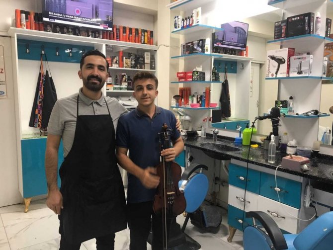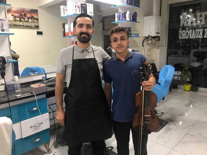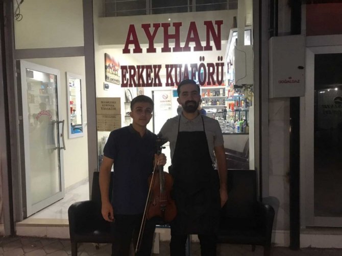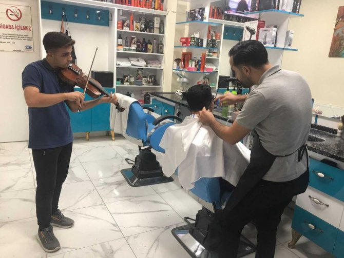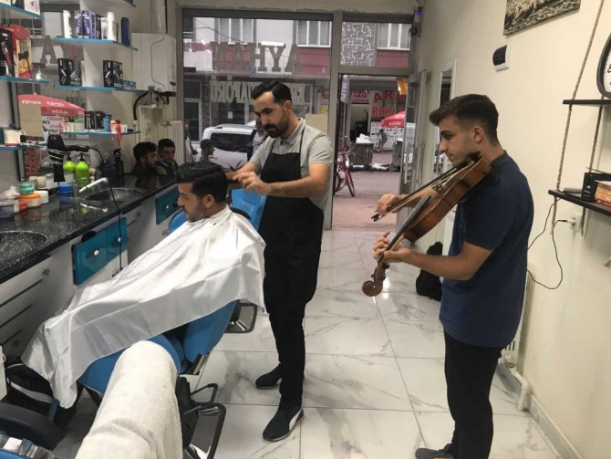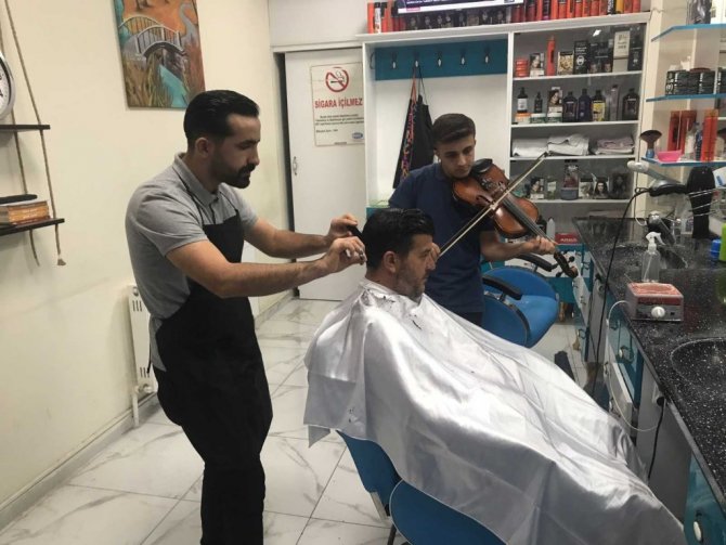 Iğdır'da erkek kuaförü olan Ayhan Filizkıran, müşterilerini viyola ve keman eşliğinde tıraş ediyor.