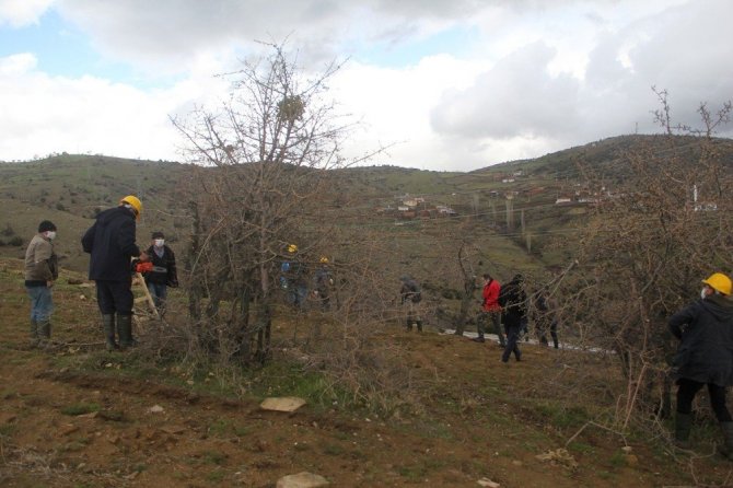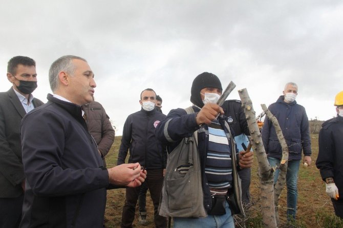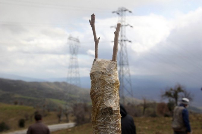 Manisa'nın Kula ilçesinde ahlat ağaçlarının aşılanarak yeniden ekonomiye kazandırılacağı projedeki çalışmaları yerinde inceleyen Manisa İl Tarım...