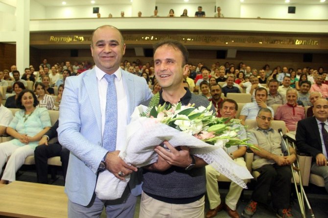 Konuşmaların ardından, İzmir İl Milli Eğitim Müdürlüğü personeli adına Yahşi’ye çiçek takdim edilirken, Yahşi de bu çiçeği, meslekte 35 yılı geride bırakan kadın personele takdim etti.