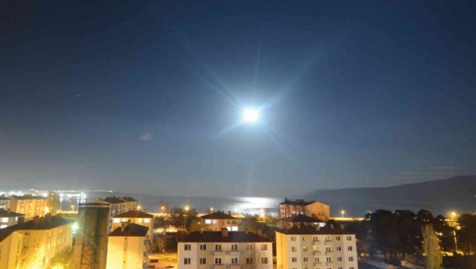 Akşam saatlerinde Türkiye'nin en büyük gölü olan Van Gölü üzerinde belirginleşen ay, gecenin karanlığına rağmen adeta gölün yüzeyini aydınlattı. Ay ve Van Gölü'nün güzelliği kendine hayran bırakırken, seyrine doyumsuz manzaralar oluşturdu. Bazı vatandaşlar, Tatvan sahili ve evlerinin balkonunda dakikalarca görüntüyü izlerken, bazıları da bu anları cep telefonlarıyla kaydetti.