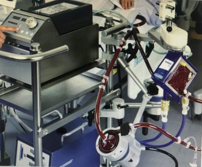 "ECMO cihazı yapay kalp- akciğer destek makinesidir. Belirli bir hastalık sebebiyle akciğerleri ya da kalbi geçici süre çalışamayan hastaların hayatta kalmasına yardımcı olur. Kan özel borular (kanül ve set) yardımıyla hastanın vücudundan alınır, makinede oksijenlenip istenilen basınçla ana damardan tekrar vücuda verilir. Covıd 19 virüsü akciğerleri ve kalbi tutmakta ve iş yapamaz hâle getirmektedir. Covıd19 hastaları için ilimizde ilk kez bir hastaya ECMO işlemi uygulanmıştır."