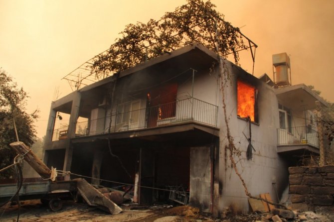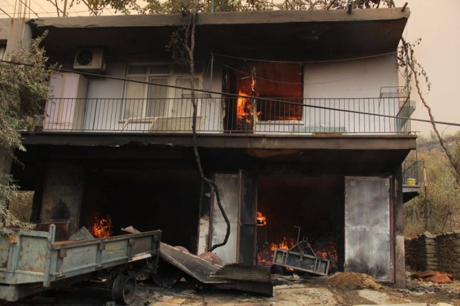 Antalya'nın Manavgat ilçesinde devam eden yangında bir ev alev topuna döndü. Ev sahibi içeriden yufka ekmeklerini kurtarırken, onlarca küçükbaş hayvanı yanarak telef oldu. Öte yandan bölgeden çok sayıda vatandaşın traktörlerle hayvanlarını taşıdıkları görüldü.