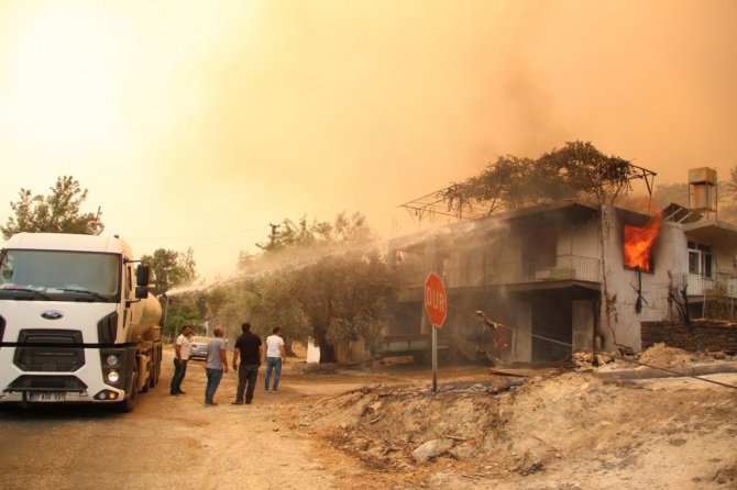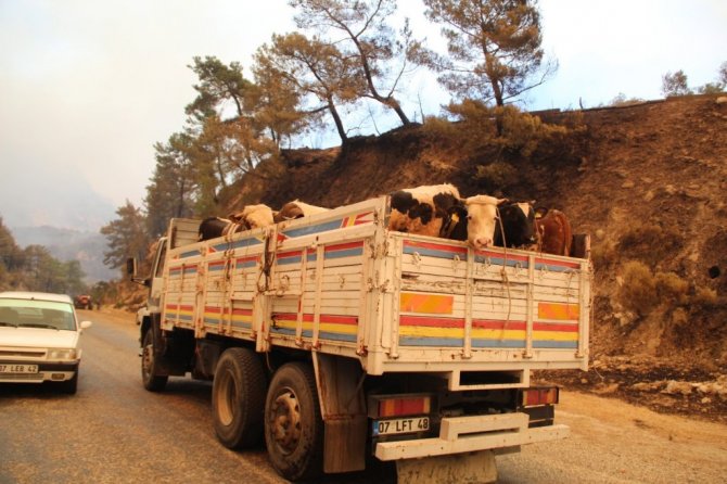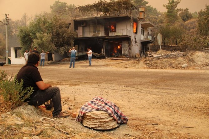 Manavgat ilçesinde dün öğle saatlerinde başlayan yangın farklı noktalarda etkisini devam ettiriyor. Yangın nedeniyle bir çok yerleşim yeri boşaltıldı. Boşaltılan mahallerdeki ev ve ahırlar alevlere teslim oldu. Oymapınar Mahallesi'nde bir vatandaş sabah saatlerinde geldiği evinin alevler içinde olduğunu gördü. Kendi imkanlarıyla yangına müdahale etmeye çalışsa da vatandaşlar başarılı olamadı. Biranda gelen alevler nedeniyle ahırlardaki küçükbaş hayvanlarda kaçamadı. Ali Özkan, her yerinden alev püsküren evini görünce büyük üzüntü yaşadı. Özkan, akrabalarıyla girdiği evden sadece yanmasın diye yufka ekmeklerini kurtarabildi. Öte yandan bölgeden çok sayıda vatandaşın traktörlerle hayvanlarını taşıdıkları görüldü.