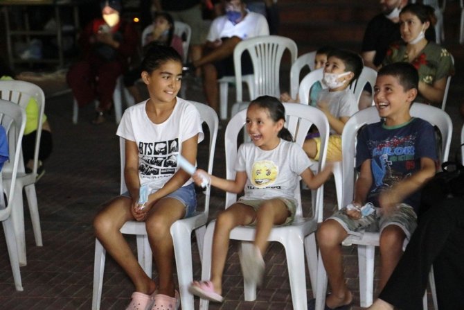 Yanan köyün meydanında çocuklar için sinema kuruldu
