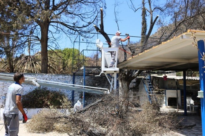 Bodrum'da 31 Temmuz'da çıkan yangında, evlere yakın bölgede bulunan ağaçların yanmış olan kısımlarını tehlike oluşturmaması için budamaya başladı.
