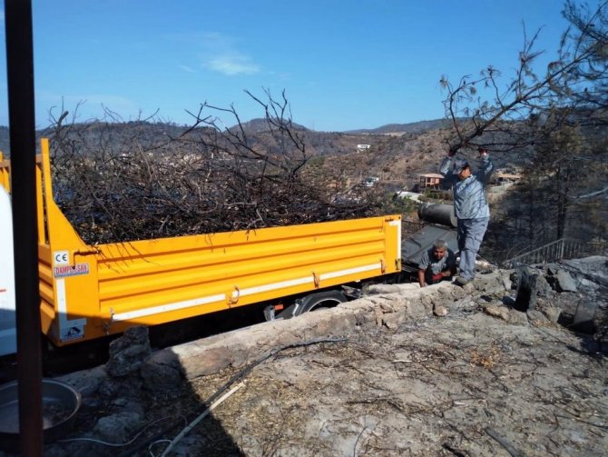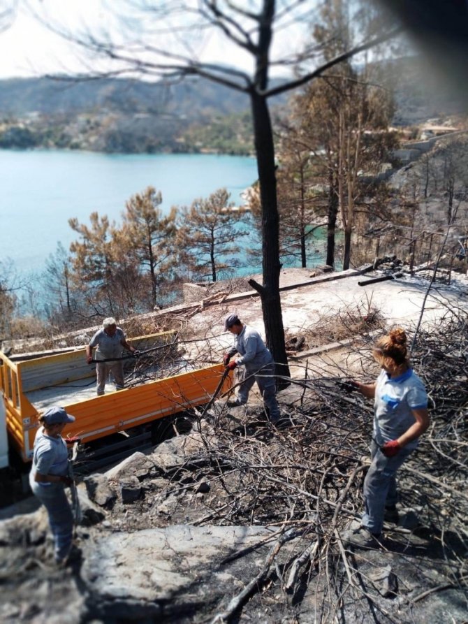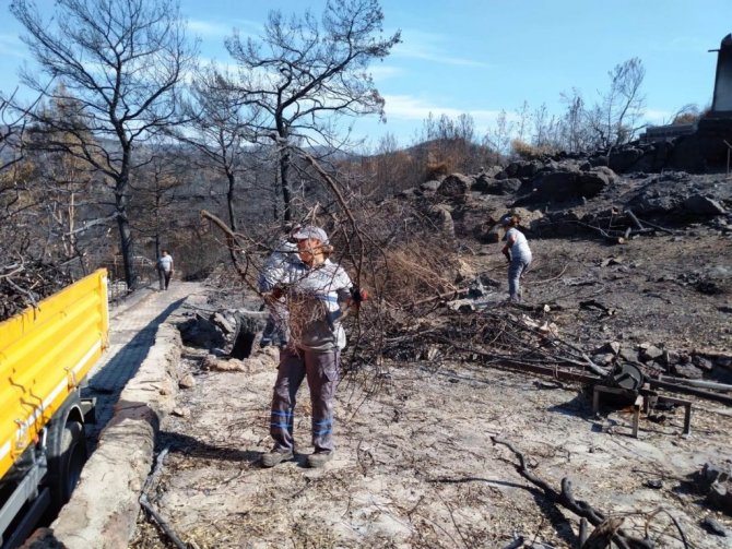 Bodrum Belediyesi Park ve Bahçeler Müdürlüğü ekipleri Mazı mahallesinde yangında zarar gören evlerin bahçelerinde bulunan yanan ağaçlara müdahale etti.