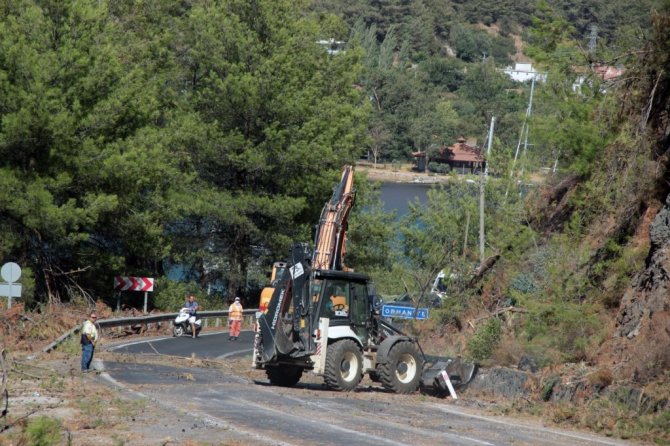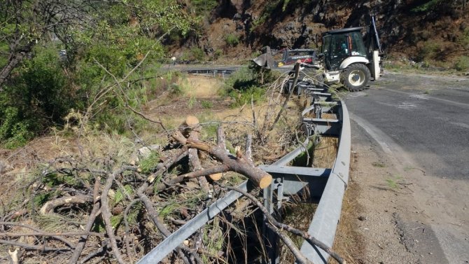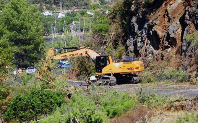 Marmaris'te büyük bir tahribata neden olan orman yangını sonrası karayolu üzerinde bulunan ve yangın riskini arttıran yol üzerindeki ağaçlarda temizlik çalışması yapılıyor.