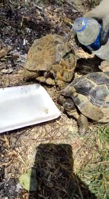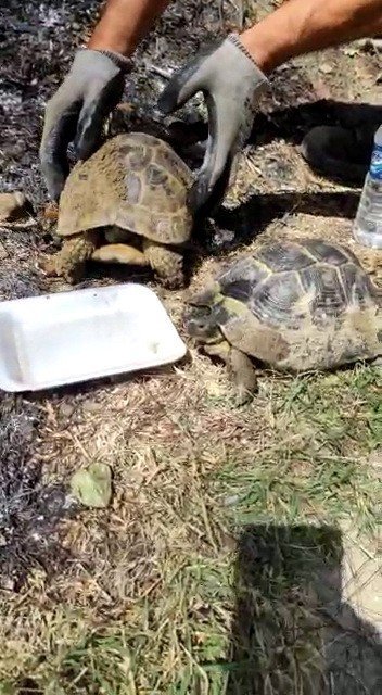 Osmaniye'nin Kadirli ilçesine bağlı Karatepe köyünde 28 Temmuz'da çıkan ve 4 günün ardından söndürülen orman yangını soğutma çalışmaları esnasında, yangında mahsur kalan iki kaplumbağayı orman işçileri kurtardı.