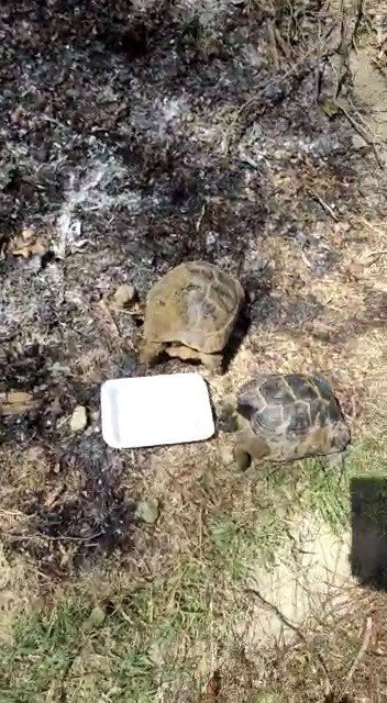 Yangında mahsur kalan iki kaplumbağayı orman işçileri kurtardı