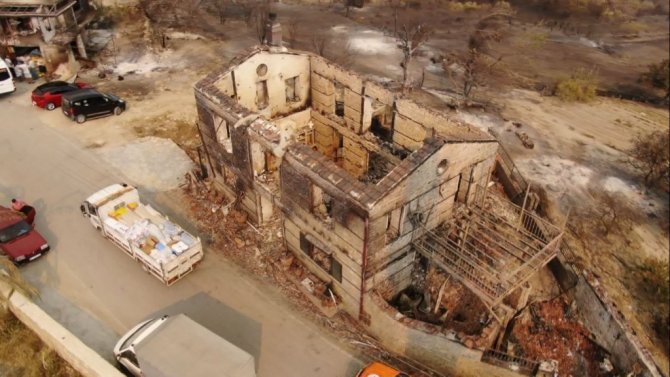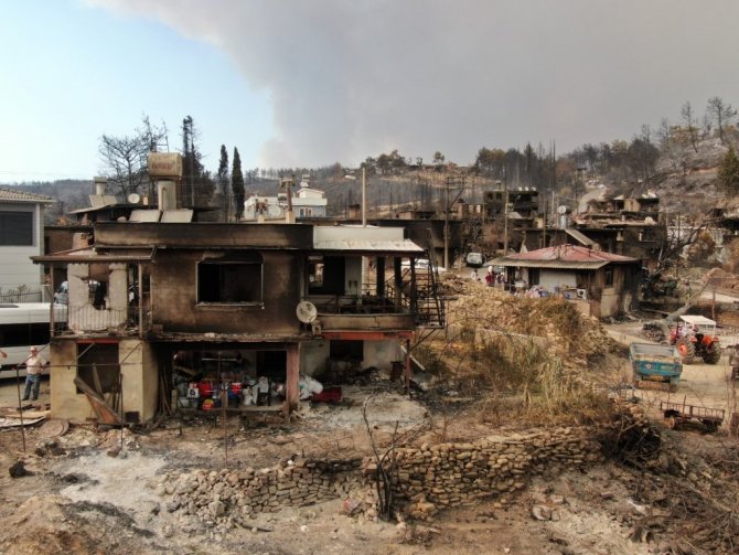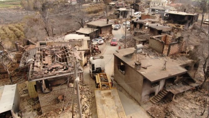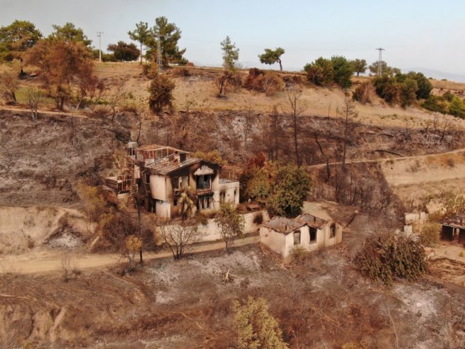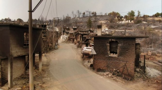 Manavgat ilçesinde 5 gün önce, 4 farklı noktada aynı anda başlayan yangını söndürme çalışmaları devam ediyor. Yangının ilk çıktığı noktalardan biri olan Kalemler Mahallesi çıkan alevlerle yerler bir oldu. Yerleşik yabancılarında yaşadığı mahalledeki tüm evler yandı. Restore edilen bir çok taş ev ve ahşap yapıların yıkıldığı görüldü. Savaş alanının andıran mahalledeki görüntü havadan drone ile görüntülendi. Havadan çekilen görüntüler felaketin boyutunu gözler önüne serdi.
