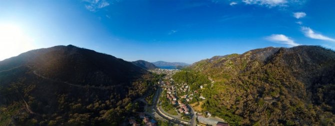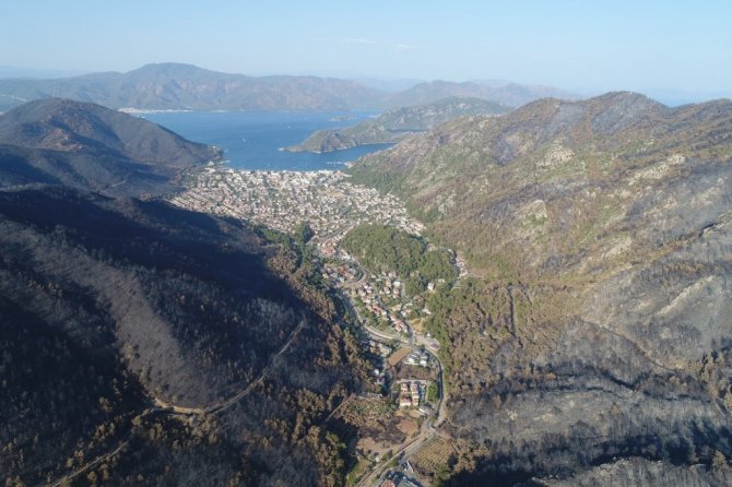 Mavi ve yeşilin buluştuğu Marmaris'te meydan gelen yangın sonrası ilçenin cennet köşelerinden geriye kalan izler havadan görüntülendi.