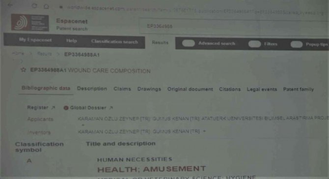 Yanık tedavisi uygulanan hastaların acılarını azaltıp daha kısa sürede sağlıklarına kavuşmaları için yara bakım ürünü geliştiren iki Türk bilim insanının çalışması Avrupa Patent Ofisi (EPO) ile Türk Patent ve Marka Kurumu'ndan (TÜRKPATENT) patent aldı.