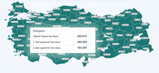 Sağlık Bakanlığı Covid-19 aşısı bilgilendirme platformunda yayınlanan verilerine göre, Eskişehir'de toplam yapılan aşı sayısı 455 bin 15 kişi gerçekleşti.