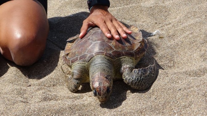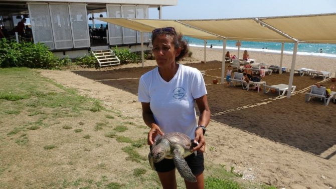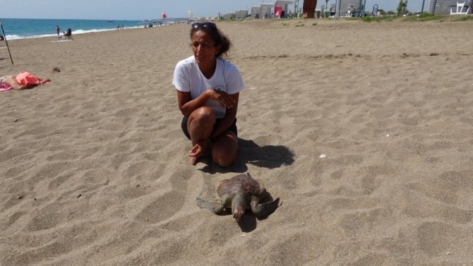 'Denizde yaralı caretta var" ihbarı üzerine geldiği Boğaz Otel sahilinde ölü caretta ile karşılaşan DEKAFOK Başkanı Seher Akyol, büyük üzüntü yaşadı.