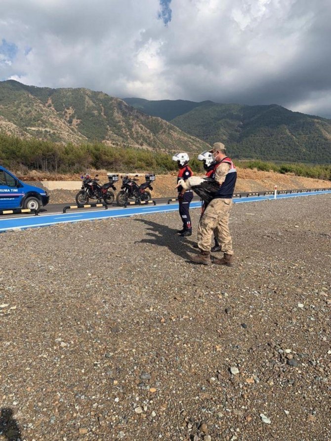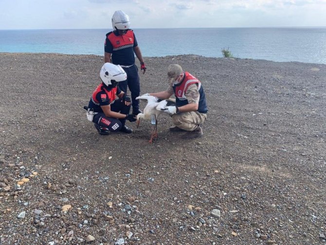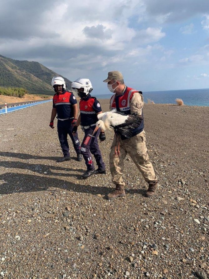 Arsuz/Kale Jandarma Karakol Komutanlığı ekipleri, Arsuz-Samandağ sahil yolu üzerinde yapılan önleyici kolluk devriyesi esnasında yol üzerinde sıcaktan ve açlıktan bitkin halde olan leylek ile karşılaştılar.