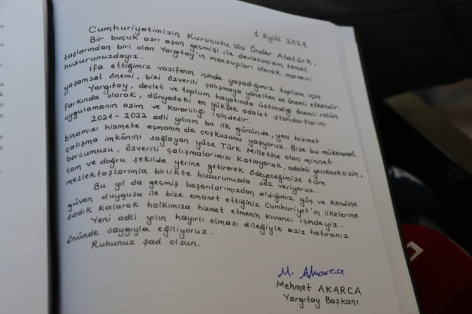 "Cumhuriyetimizin kurucusu Ulu Önder Atatürk, bir buçuk asrı aşan geçmişi ile devletimizin temel taşlarından biri olan Yargıtay'ın mensupları olarak manevi huzurundayız. İfa ettiğimiz vazifenin içinde yaşadığımız toplum için, yaşamsal önemi bizi özverili çalışmaya yönelten en önemli etkendir. Yargıtay devlet ve toplum hayatından üstlendiği önemli rolün farkında olarak, dünyadaki en yüksek adalet standartlarını uygulamanın azim ve kararlığı içindedir. 2021-2022 adli yılının ilk gününde yeni hizmet binamızın hizmete açmanın da coşkusunu yaşıyoruz. Bize bu mükemmel çalışma imkanını sağlayan yüce Türk milletine olan minnet borcumuzu özverili çalışmalarımızı katlayarak adaleti gecikmeksizin tam ve doğru şekilde yerine getirerek ödeyeceğimize tüm meslektaşlarımızla birlikte huzurunuzda söz veriyoruz. Bu yıl da geçmiş başarılarımızdan aldığımız güç ve kendine güven duygusu ile bize emanet ettiğiniz Cumhuriyetin ilkelerine sadık kalarak halkımıza hizmet etmenin kıvancı içerisindeyiz. Yeni adli yılın hayırlı olması dileğiyle aziz hatıranız önünde saygıyla eğiliyoruz, ruhunuz şad olsun."