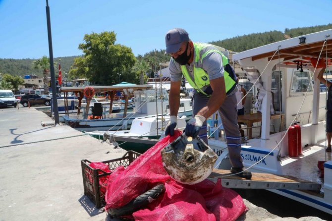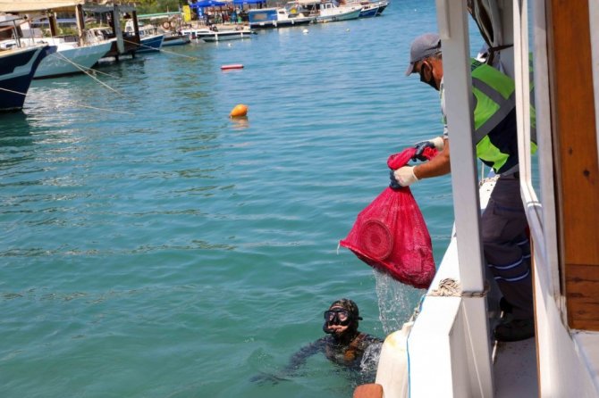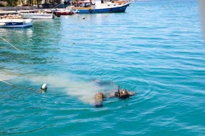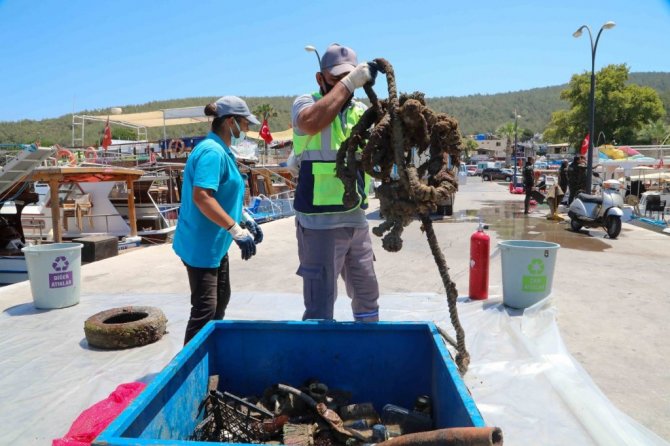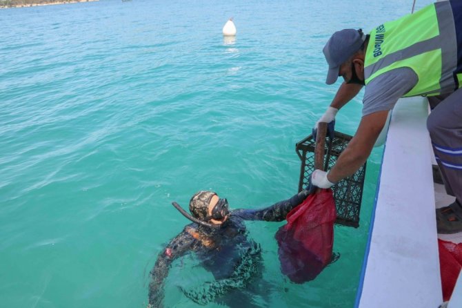 Bodrum Belediyesi Dalış Ekibi'nin "Denize en çok mavi yakışır!" sloganını temel alarak çevre koruma kapsamında gerçekleştirdiği deniz dibi temizliğinde 2 saatte yarım ton çöp çıkarıldı.