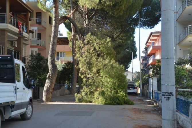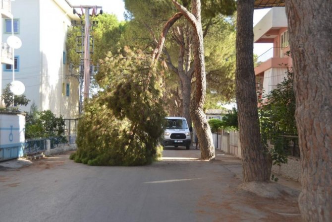 Denizli'nin Sarayköy ilçesinde kaldırımda bulunan çam ağacı sabah saatlerinde kırılarak yola devrildi.