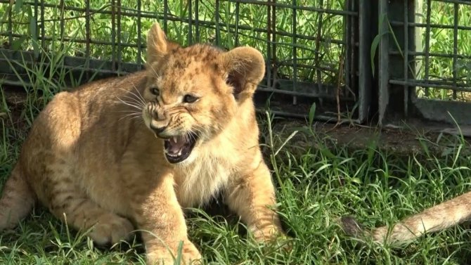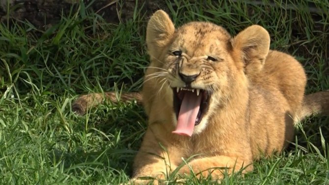 Yavru aslan boyuna bakmadan sağa sola kükredi