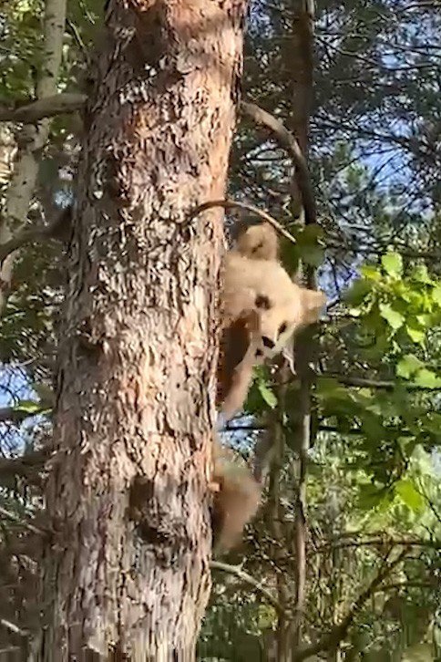 Yavru ayı orman işletme ekiplerini görünce korkudan ağaca böyle tırmandı