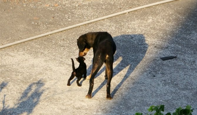Osmaniye merkez Yıldırım Beyazıt Mahallesi Musa Şahin Bulvarı üzerinde bulunan bir iş yerinin damında annesi tarafından terk edildiği düşünülen yavru kediye bir köpeğin arkadaşlık ettiği görüldü. İş yerinin damında yavru kediyle oyun oynayan köpeğin gülümseten eğlenceli hareketleri kameralara yansıdı. Zaman zaman köpeğin sırtına çıkmaya çalışan yavru kediyi köpeğin sahiplendiği görülürken ikilinin oyun arkadaşlığı dakikalarca devam etti.