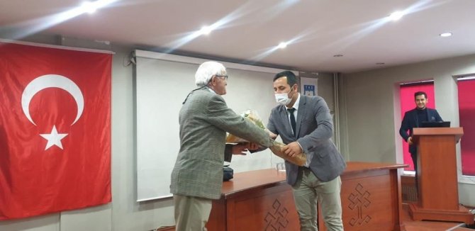 Söyleşi sonrasında Tarihçi Yazar Ercüment Asaf Yanıç'a günün anısına Münif Paşa İl Halk Kütüphanesi Müdürü Serdal Köse tarafından çiçek takdim edildi.