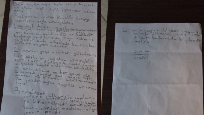 Taylan Özgür Ayfer, yazmış olduğu mektubunda, "Ben Taylan Özgür Ayfer. Okulum Atatürk İlkokulu. Sınıfım 4-A. Öğretmenim Zeliha Meriç. Su israfının ekolojik dengeye zararlarını şöyle sıralayabiliriz; 1'inci madde, su israfı, denizlerin ve göllerin kurumalarına yol açar. Denizler ve göller kurursa balıklar ölür. Bu da ülkemizde bulunan hayvanların sayısını azaltır. 2'nci madde, insanlar yeşil alanları yok etmemelidir. Çünkü bu yağışları arttırabilir. Eğer neden diyorsanız, çünkü fark etmişseniz bu günlerde hava sıcaklıkları artmaktadır. Her geçen gün ülkemizde yapılan yapı sayısı artmaktadır ve ormanlar azalmaktadır. Bu yüzden ağaç sayısını artırmalıyız. 3'üncü madde, maalesef ülkemizde yapılan yapıların betonları yeraltı sularını kirletmektedir. Bunun için inşaat alanındaki meslekler bilgilendirilmelidir. 4'üncü madde, atık yağları klozet veya lavaboya dökmemeliyiz. İnsanları bu konuda bilgilendirmeliyiz" ifadelerine yer verdi.
