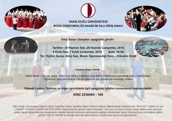 Yakın Doğu Üniversitesi (YDÜ) Atatürk Eğitim Fakültesi Güzel Sanatlar Eğitimi Bölümü Müzik Öğretmenliği Anabilim Dalı, 2016-2017 eğitim yılı için Lisans, Yüksek Lisans ve Doktora programlarına öğrenci...