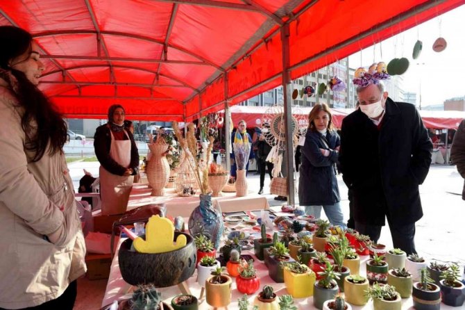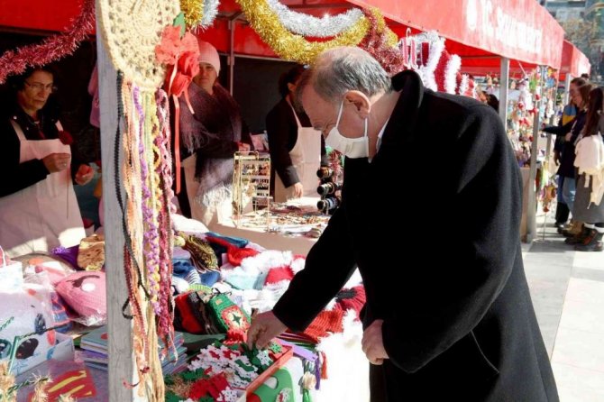 Başkan Akif Kemal Akay da kurulan hediyelik eşya stantlarından hediyelik yeni yıl armağanları alırken, kadınları kutladı.