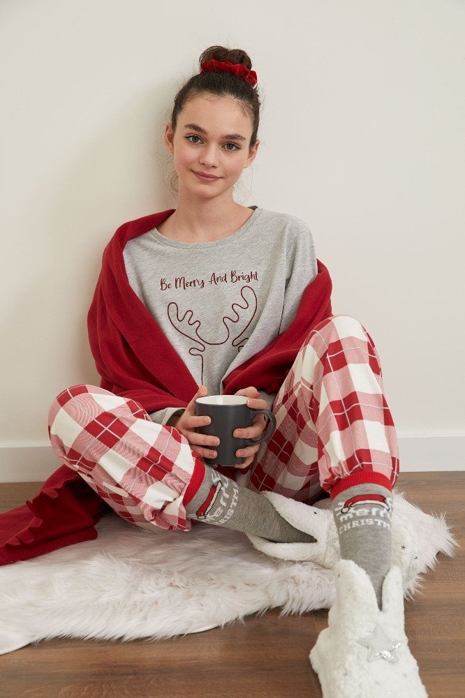 Ev giyim ve pijama seçeneklerinden oluşan tasarımlarda kırmızı, siyah, bordo, beyaz ve gri tonlarının hakimiyeti görülüyor. Saten ve pamuklu kumaşlardan hazırlanan parçalarda, dantel detaylarının yanı sıra kardan adam, kar tanesi, kalp ve çam ağacı gibi yılbaşı konseptine vurgu yapan desenler yer alıyor. Ev şıklığını tamamlayan yumuşacık terlik ve panduflar ise ışıltılı dokunuşlarla yeni yıla keyifli bir adım atmaya yardımcı oluyor.