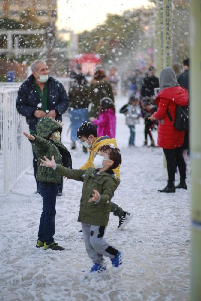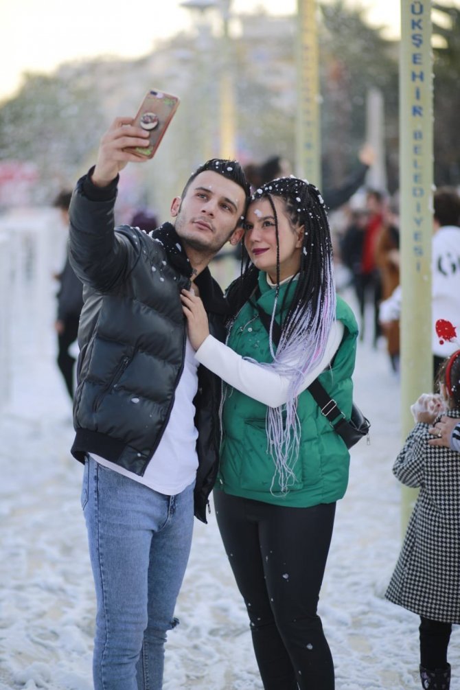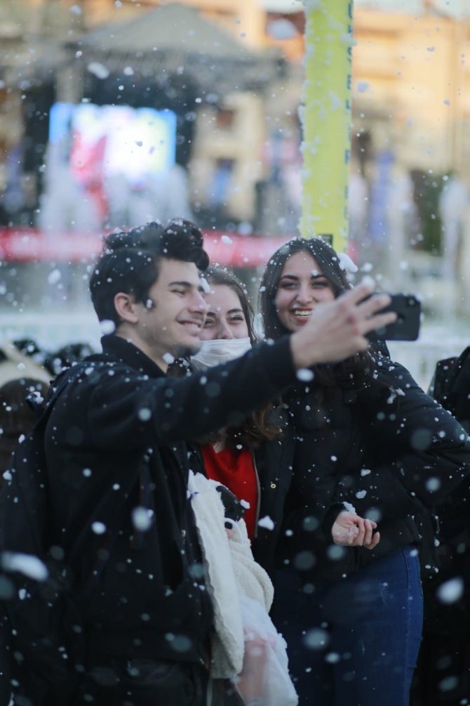 Yeni yıla saatler kala Aydın Büyükşehir Belediyesi, mesai bitiminde Aydınlılara kar sürprizi yaptı. Atatürk Kent Meydanı'na yağdırılan yapay kar ile vatandaş eğlenceli dakikalar yaşadı. Kar köpüklerinin altında hatıra fotoğrafı çekilen vatandaşlar, renkli görüntüler ortaya çıkardı.