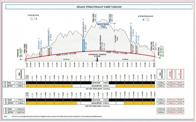 Tamamlandığında dünyanın en uzun ikinci, Avrupa ve Türkiye'nin en uzun karayolu tüneli olacak 14,5 kilometre uzunluğundaki yeni Zigana tünelinde kazı çalışmaları yüzde 89 seviyesine ulaşıldığı ve kazı çalışmalarında yıl sonunda ışık görüneceği belirtildi.