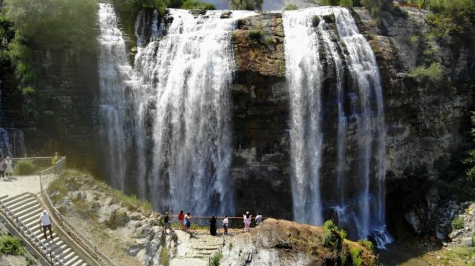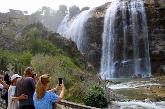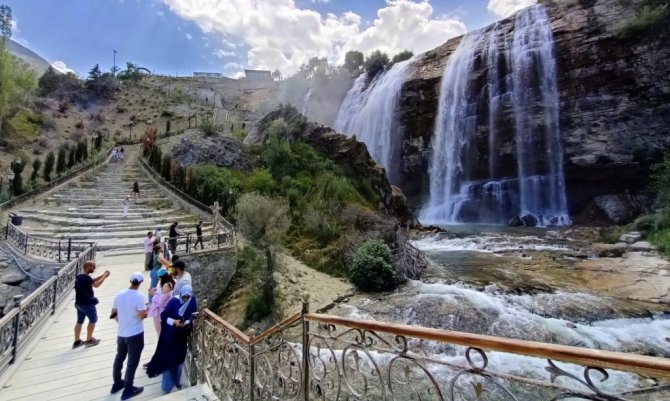Kurban Bayramı'nın gelmesiyle birlikte yerli ve yabancı turistler, Asya ile Avrupa'nın en yüksek şelalesi olan Tortum Şelalesi'ne akın etti.