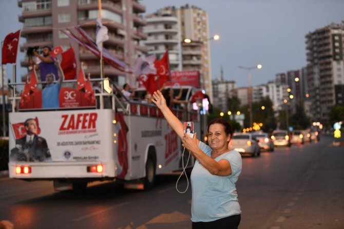 Otobüsten yükselen müzik eşliğinde kortej güzergahı boyunca evlerinin balkonundaki ve sokaktaki vatandaşları selamlayan katılımcıların Zafer Bayramı coşkusu Forum Mersin'de sona erdi.