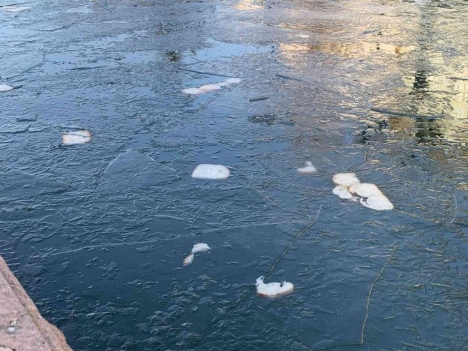 Yer yer donmuş Porsuk Çayı üzerinde ekmek parçaları