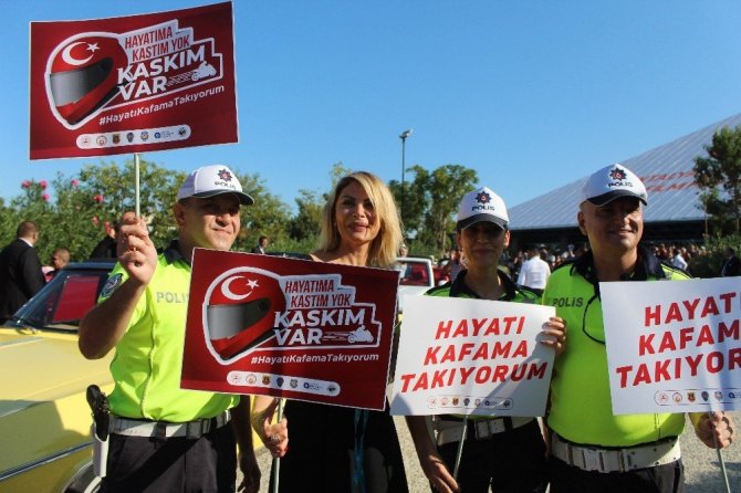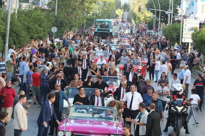 Kortejin en önünde klasik otomobilde Salih Güney ve Selma Güneri ile birlikte yer alan Başkan Muhittin Böcek kalabalığı selamladı.