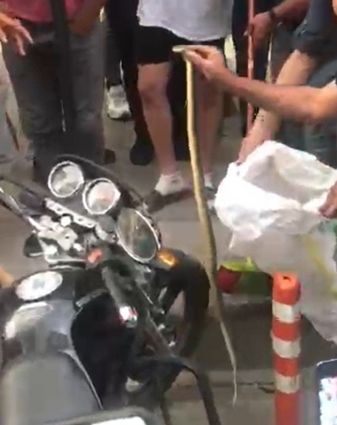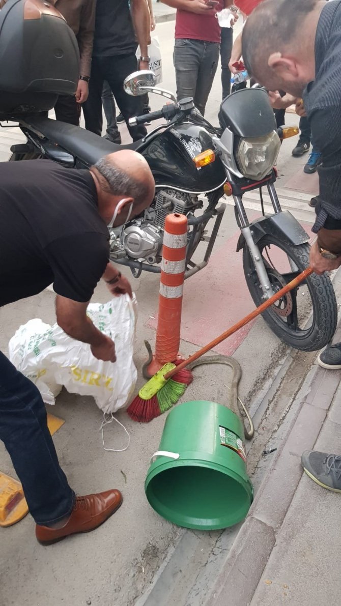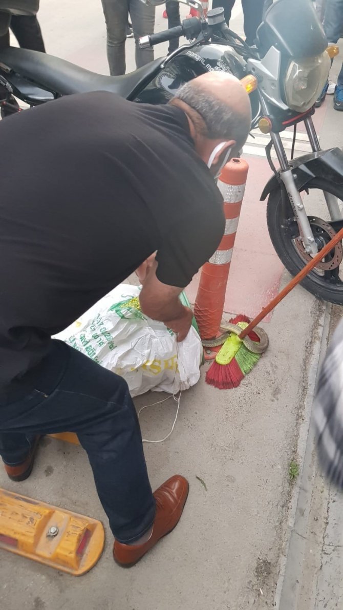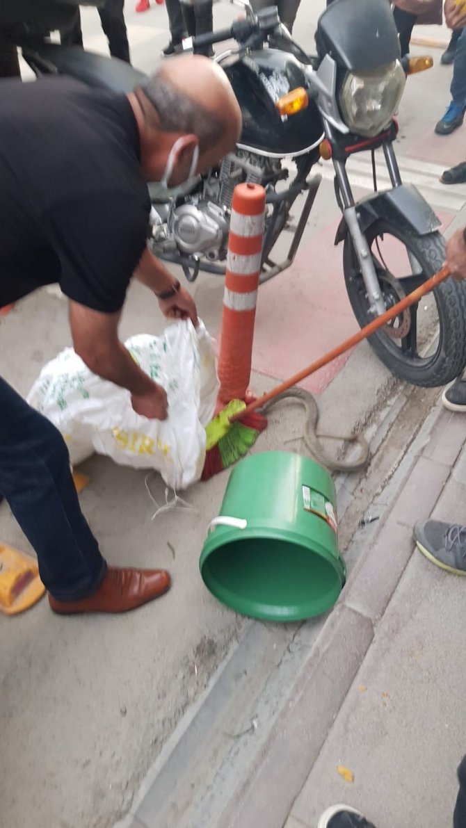 Olay, kentin en işlek caddesi olan Gazi Caddesinde meydana geldi. Edinilen bilgiye göre, bir motosikletin tekerine dolaşan yılanı gören vatandaşlar kendileri müdahale etti. Fırça ile kovaya sokulmaya çalışılan yılan, ardından yol kenarındaki dubaya dolandı. O sırada bir vatandaş yılanı eliyle tutarak çuvala koydu. Belediye ekiplerine teslim edilen yılan, kentin uzağına götürülerek doğaya salındı.