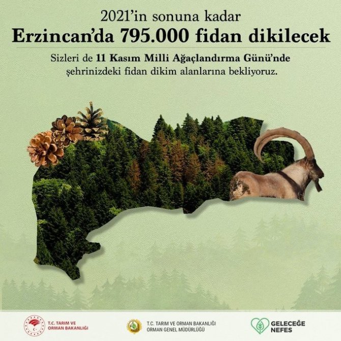 Tarım ve Orman Bakanı Bekir Pakdemirli, Twitter hesabından yaptığı paylaşımda, bu yılsonuna kadar dikilecek fidanlara ilişkin açıklama yaptı. Bakan Pakdemirli, paylaşımında şunları kaydetti: "2021'in sonuna kadar, Erzincan'da 795 bin tüm Türkiye'de ise 252 milyon fidan dikerek "Geleceğe Nefes" oluyoruz. Sizleri de 11 Kasım Milli Ağaçlandırma Günü'nde şehrinizdeki fidan dikim alanlarına davet ediyoruz."