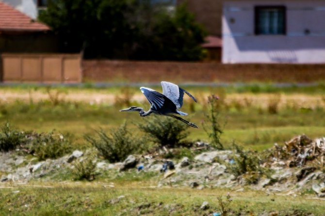 Eskişehir'de sulama kanalı yakınlarında yiyecek arayan gri balıkçıl objektife yansıdı.