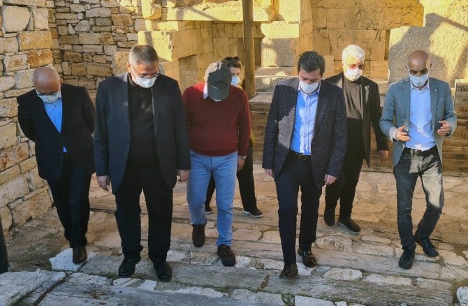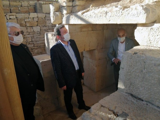Linyit madeni sahasından çıkarıldıktan sonra arkeopark alanına taşınan anıtsal mezar türlerini, tarihi zeytinyağı işliğini ilgiyle inceleyen Muğla Valisi Tavlı, Milas Müze Müdürü Mehmet Çelebi'den kültür varlıkları hakkında bilgi aldı.