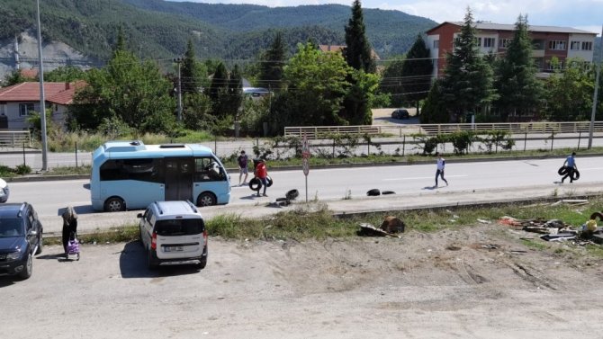 Yola savrulan lastikler tehlike oluşturdu