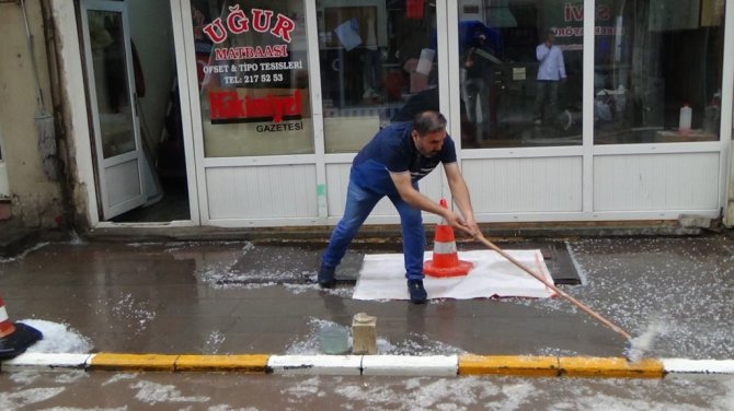 Yağmur ve doluya hazırlıksız yakalanan vatandaşlar, iş yerleri ve saçak altlarına sığındı. Kentteki esnaf ise iş yerlerinin önünde biriken doluyu kürek ve fırça yardımıyla temizledi.