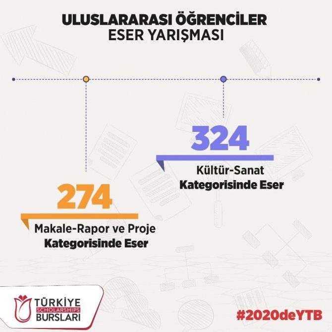 Türkiye'de öğrenim gören uluslararası öğrencilerin ortaya koyduğu eserlerin değerlendirilmesi ve ödüllendirilmesi amacıyla "Uluslararası Öğrenciler Eser Yarışması" düzenlendi. Bu kapsamda farklı disiplinlerde eğitim gören öğrencilerden "Pandemi Sonrası Dünya" ve "YTB'nin 10. Yılı" başlıkları altında makale, proje veya rapor çalışması yaparak eser sunması istendi. Bununla birlikte uluslararası öğrenciler, kültür-sanat alanında da YTB'ye eserlerini iletme imkânı buldu. Yarışma kapsamında Makale-Rapor ve Proje kategorisinde 274 eser, Kültür-Sanat kategorisinde ise 324 eser takdim edildi.