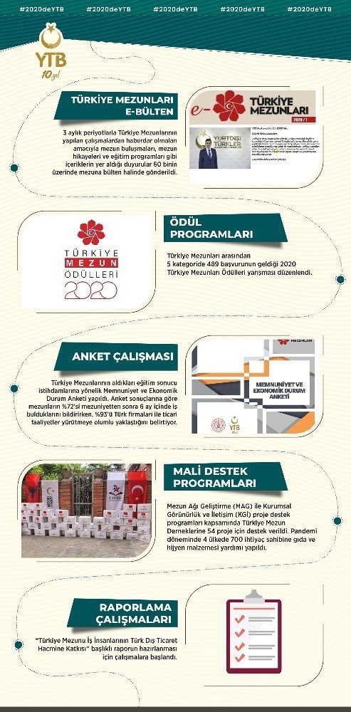 2020 yılında YTB tarafından farklı ülkelerden gelerek yüksek öğrenimlerini Türkiye'de tamamlayan ve faaliyet gösterdikleri alanlarda üstün başarı elde eden Türkiye mezunlarının ödüllendirilmesi amacıyla 2020 Türkiye Mezunları Ödülleri programı düzenlendi. Beş kategoride yürütülen program 489 başvuru aldı.