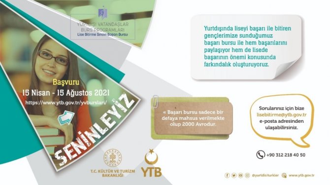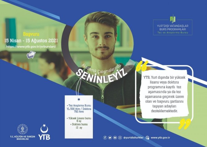 "Yurtdışı Vatandaşlar Lise Bitirme Sınavı Başarı Bursları", "Yurt Dışı Vatandaşlar Tez Araştırma Bursu", "Yurt Dışındaki Türk Çocuklarına Türkçe Öğretimi Yüksek Lisans Programı" ve "Prof. Dr. Fuat Sezgin Üstün Başarı Bursları" programına son başvuru tarihi 15 Ağustos 2021 olarak belirlendi. Programlara ilişkin detaylı bilgiler ve başvuru şartları "https://www.ytb.gov.tr/yvburslari/" adresinde yer alıyor.