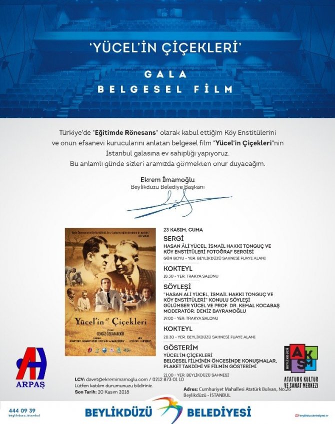Söyleşinin ardından saat 21.00’de BAKSM Beylikdüzü Sahnesi’nde "Yücel’in Çiçekleri" belgesel filminin gala gösterimi gerçekleştirilecek. Ambarlı Römorkaj Pilotaj AŞ (ARPAŞ) ana sponsorluğunda, Batı İstanbul Vakfı’nın katkılarıyla, Beylikdüzü, Büyükçekmece, Çatalca ve Silivri Belediyelerinin kısmi desteğiyle çekilen belgesel film bu anlamda bir Batı İstanbul projesi olma özelliği taşıyor. 1940’lı yıllarda hayata geçirilen Köy Enstitüleri Projesi’ni dönemin Milli Eğitim Bakanı Hasan Âli Yücel ve İlköğretim Genel Müdürü İsmail Hakkı Tonguç’un yaşam hikayeleri üzerinden anlatan "Yücel’in Çiçekleri" belgesel filminin BAKSM’de gerçekleşecek gala gösterimine, sanatseverlerin büyük ilgi göstermesi bekleniyor.