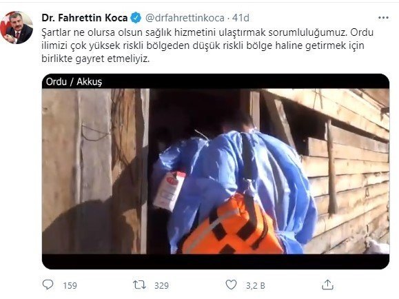 Sağlık Bakanı Dr. Fahrettin Koca da, sosyal medya hesaplarından videoyu paylaşarak, "Şartlar ne olursa olsun sağlık hizmetini ulaştırmak sorumluluğumuz. Ordu ilimizi çok yüksek riskli bölgeden düşük riskli bölge haline getirmek için birlikte gayret etmeliyiz" açıklamasında bulundu.