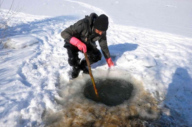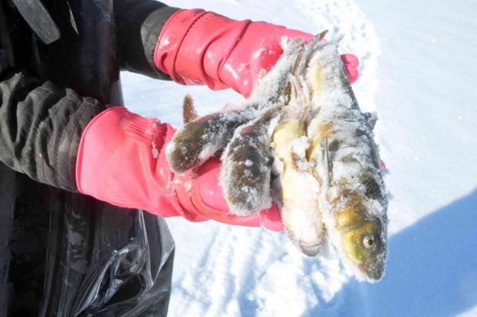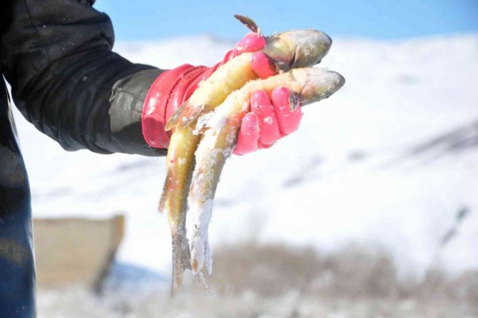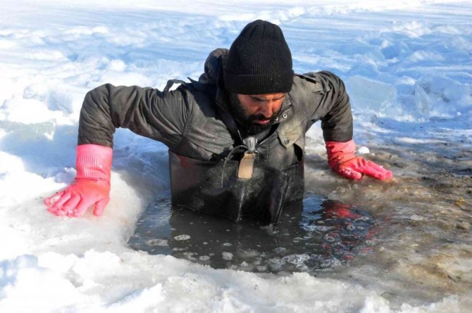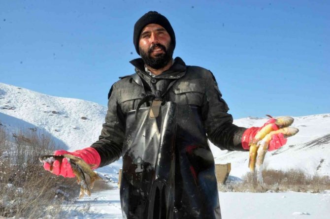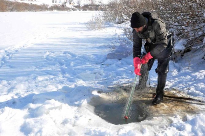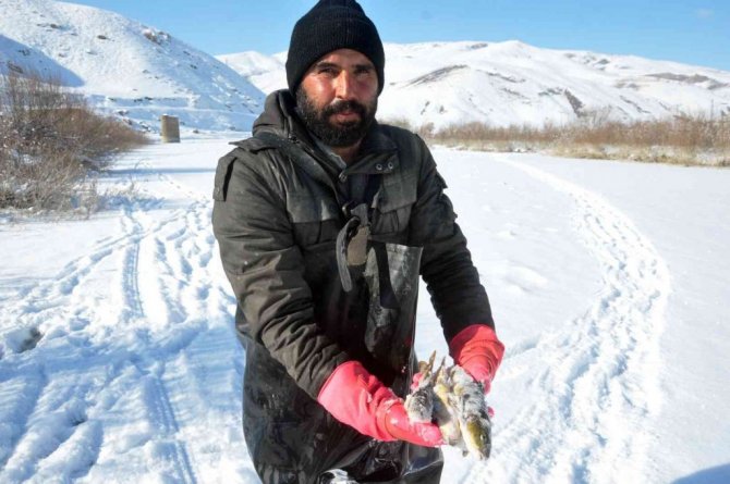 Yüksekova ve çevresinde geçen hafta etkili olan kar yağışının ardından hava sıcaklığının eksi 25 dereceye kadar düşmesi, derelerin donmasına neden oldu. Yaz aylarında farklı işler yaparak evini geçindiren Nazım Taşkın, eksi 25 derece soğuk havaya ve tehlikelere aldırmadan, donan derelerde balık avlıyor. İlçe merkezine yaklaşık 15 kilometre uzaklıkta bulunan Büyükçayır Deresi'ne giden Nazım Taşkın, buzları kırarak akşam saatlerinde suya bıraktıkları ağlarını, sabah saatlerinde yine kazma ve küreklerle buzları kırarak geri alıyor. "Kışın evimizi bu şekilde geçindiriyoruz" diyen Nazım Taşkın, "Biz burada öncelikle baltayla o donan buzu kırıyoruz, ardından ağlarımızı gönderiyoruz. Aslında biz bu ağları sabah gönderiyoruz ve akşam da balıklarımızı tutuyoruz. Malum her sene olduğu gibi buraya gelip balıkları tutmaya çalıştık. Tamamen donan dereye gelerek, buzları kazma ve küreklerle kırıp balık avlıyoruz. Biz de bu soğukta geliyoruz, mecburuz. Şükür, nasibimizde ne varsa alıp evimize götürüyoruz" dedi.