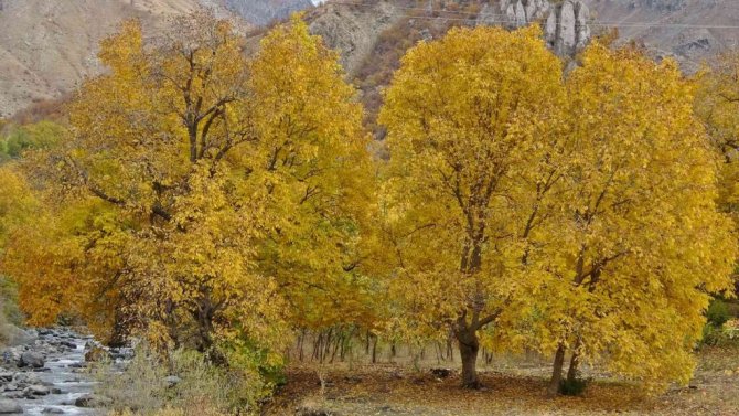Hakkari'nin Yüksekova ilçesinde sonbaharla renk cümbüşüne bürünen ağaçların güzelliği mest ediyor.