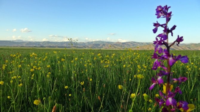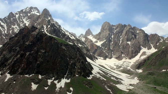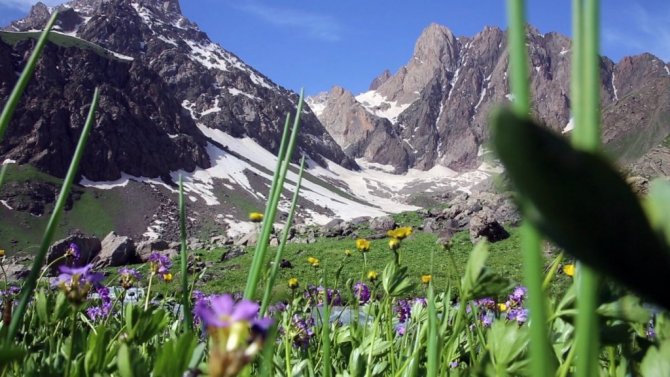 Hakkari'nin Yüksekova ilçesinde çiçeklerle süslenen yaylaların karlı dağlarla bütünleşmesi görsel şölen sunuyor.